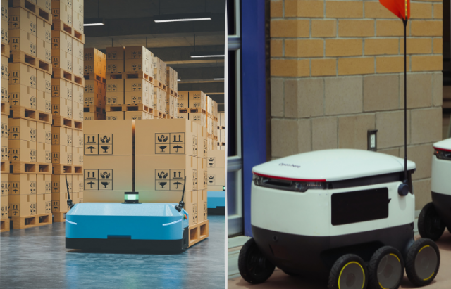 "La adopción de robots móviles autónomos flexibles admite múltiples aplicaciones, incluidos sistemas de transporte y transferencia de materiales, al tiempo que recopila datos automáticamente. Un robot inteligente puede encontrar y mover cualquier cosa en un almacén, desde piezas en stock, paletas en almacenes, piezas de repuesto en fábricas o embalajes en centros de distribución." otro ejemplo: "En el centro de distribución de DHL, los robots móviles autónomos ayudan a gestionar y operar toda una cadena logística de repuestos, desde pedidos por pedido hasta la entrega a los clientes", dice uno de los alumnos de la maestría en robótica.